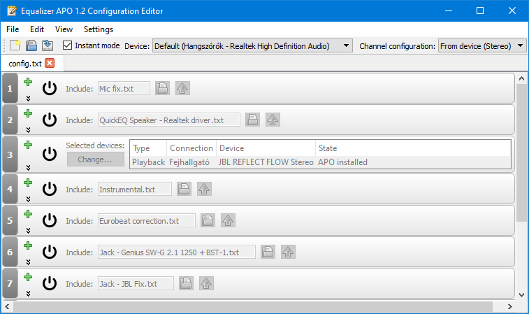 - If unrelated audio devices (sometimes even microphones) start misbehaving, check if Equalizer APO is limited to the output device you want to configure (use a Device filter before the configuration).