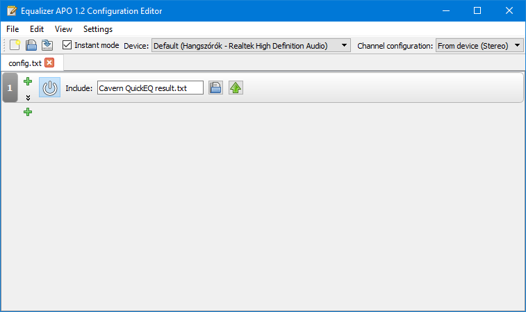 - Include the Cavern result to the config.txt found in Equalizer APO's folder. That is the only file it will ever use, doesn't matter what you have open.