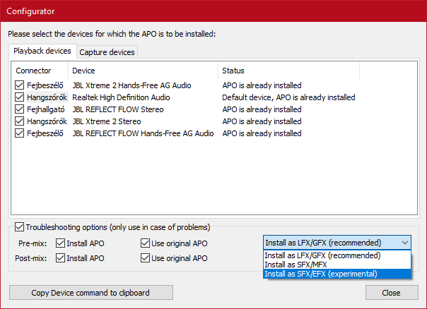 - If the EQ is correctly applied, appears on the Analysis panel, but the system still sounds the same, open Equalizer APO's Configurator, and set up the device as SFX/EFX. This requires a restart.