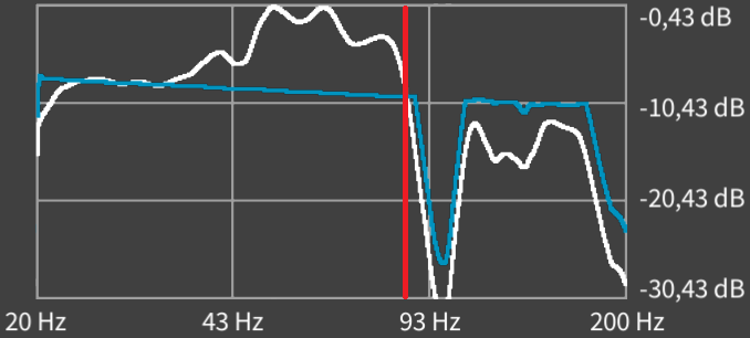 In this case, while the subwoofer is mostly usable above 87 Hz, we don't want to set the crossover above that, as it's neither efficient, nor free of notches. When you hover the mouse over the graph, QuickEQ will display the exact frequency. If the frequency isn't displayed just below the graph, click once in the Cavern window. Let's see the channel we want to cross over to this sub: