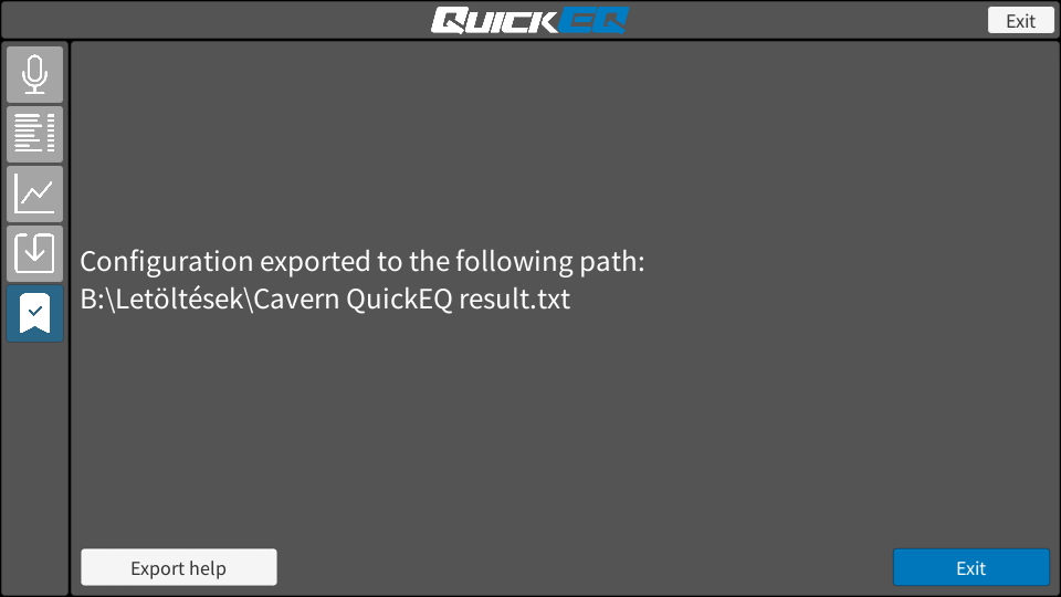 After an export is complete, the following screen appears, with the Export help button that opens the export documentation, and an Exit button that returns to the main menu of the Cavern Driver: